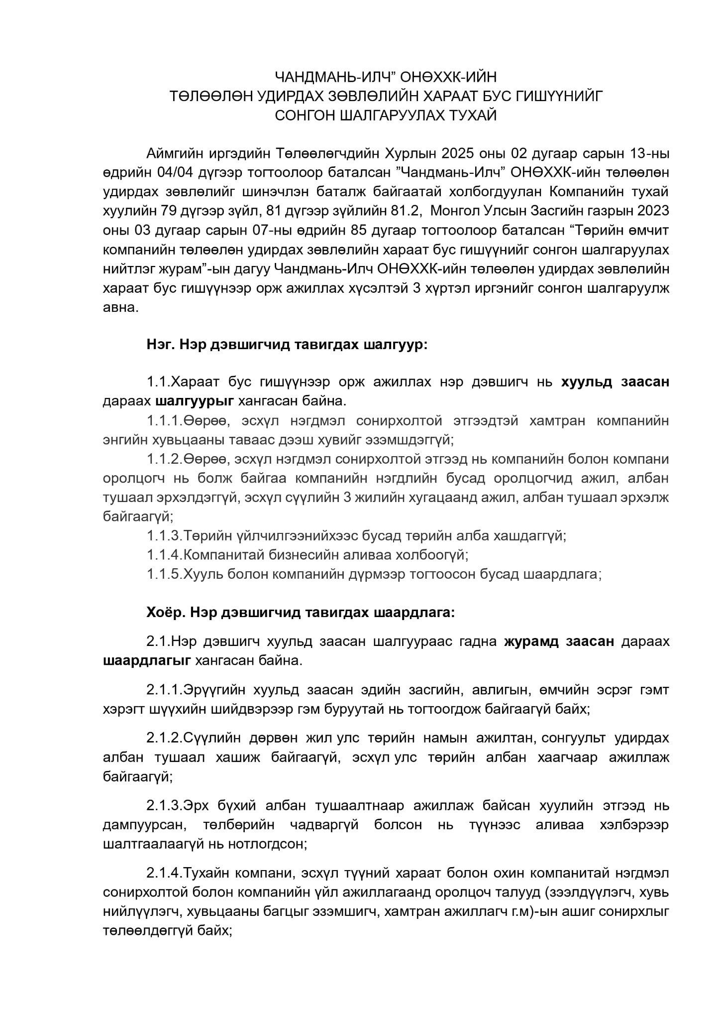 ЧАНДМАНЬ-ИЛЧ” ОНӨХХК-ИЙН ТӨЛӨӨЛӨН УДИРДАХ ЗӨВЛӨЛИЙН ХАРААТ БУС ГИШҮҮНИЙГ СОНГОН ШАЛГАРУУЛАХ ТУХАЙ